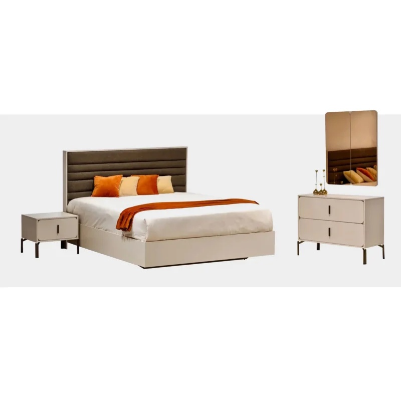 Chambres à coucher : lits deux places, têtes de lit capitonnées, armoires spacieuses, commodes et coiffeuses pour une organisation optimale.
