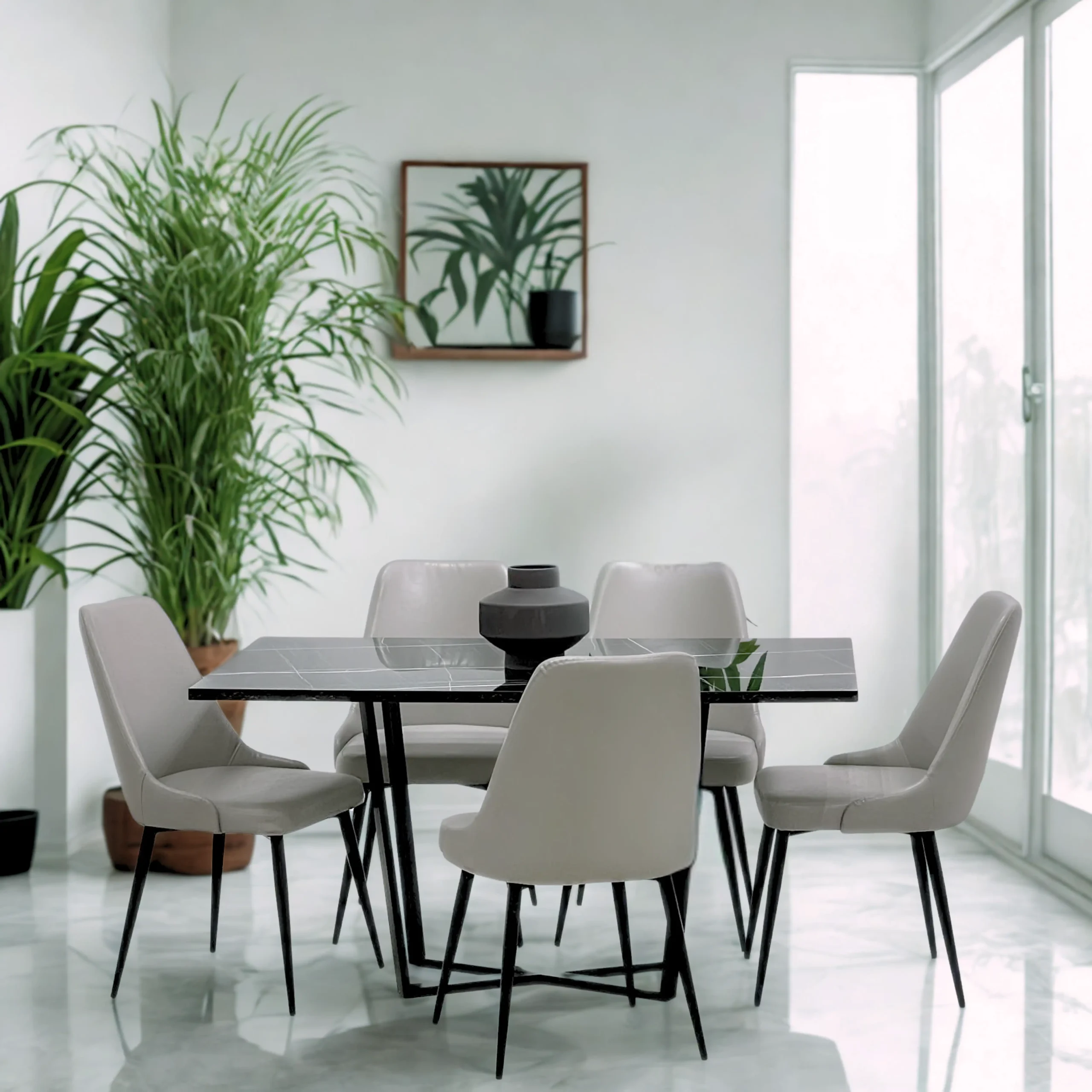 Cette table contemporaine Noir Disponible en six chaises au design élégant, est parfaitement dans l’air du temps. Le socle de la table et les pieds des chaises, en noir mat, apportent un contraste moderne et raffiné. Les assises en simili-cuir gris offrent à la fois confort et style L’ensemble crée une harmonie visuelle entre sobriété et modernité, idéal pour une salle à manger ou cuisine chic et actuelle.